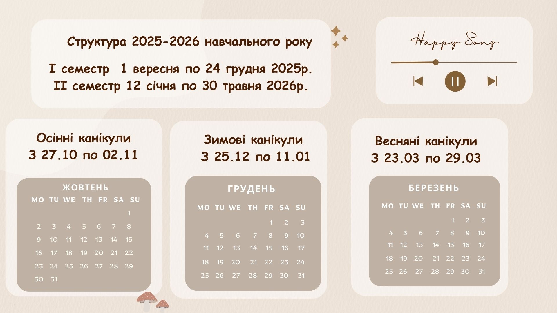 У 2025-2026 навчальному році у нашій школі почнеться у понеділок 1 вересня 2025 року і триватиме до 30 травня 2026 року включно.